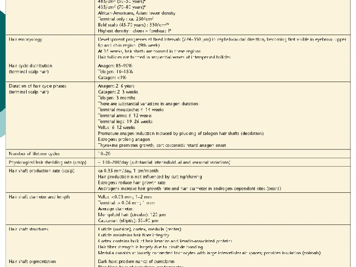 BIOLOGY OF HAIR GROWTH ¡ ¡ ¡ Hair growth on the scalp occurs in cycles of intermittent activity; phases of growth are followed by periods of quiescence. Anagen: Phase of normal active growth. Catagen: Brief transition phase(between anagen and telogen) during which hair growth stops. Telogen: Resting phase. Duration and rate of growth of anagen phase ( varying at different body sites, in different individuals, and at various ages) determine the ultimate length of hair in that area.