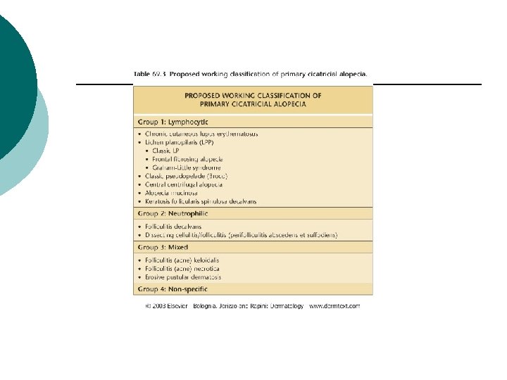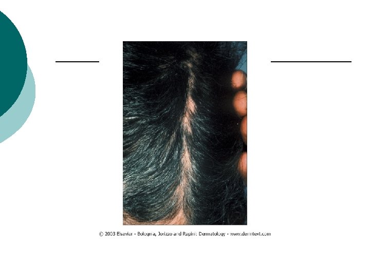 Differential diagnosis ¡ Nonscarring alopecia: Secondary syphilis, white-patch tinea capitis, trichotillomania, traction alopecia, early DLE, androgenetic alopecia.