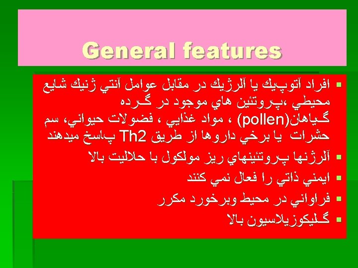 General features(2) § There is a strong genetic predisposition for the development of immediate hypersensitivity *high level of Ig. E synthesis often run in families • Class –II MHC alleles • One locus for atopy is on chromosome 5, near the site of gene cluster encoding the IL-3, IL-4, • IL-5, IL-9, IL-13 and IL-4 R