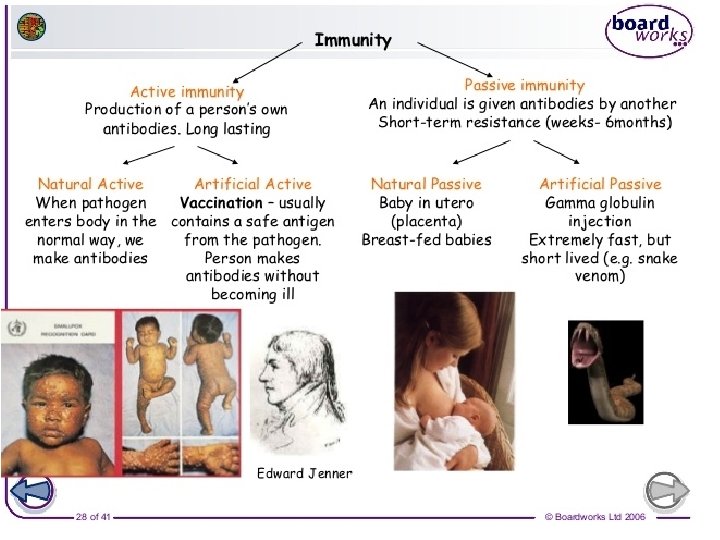 NATURAL ACTIVE IMMUNITY • Here antibodies produced to fight the pathogens come naturally from the patient’s own lymphocytes. This may be done in two ways: • 1). When pathogens infect the body, the patient’s lymphocytes will make antibodies to fight them. Some of these lymphocytes remember the pathogen so that next time the patient is infected, the lymphocytes can produce antibodies much more quickly and the pathogen does less damage. • 2). The ability to quickly make specific antibodies could be inherited from parents.