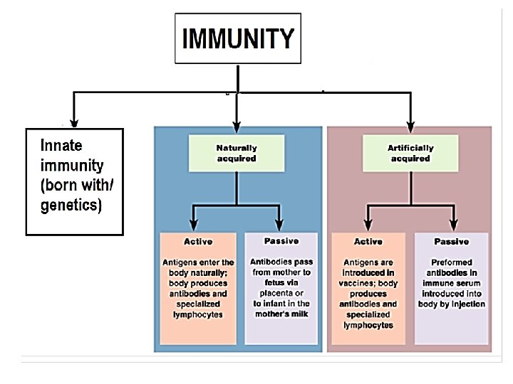 SUMMARY IMMUNITY • Natural Active: Antibodies produced to fight the pathogens come naturally from the patient’s own lymphocytes (after infection or genetic predisposition). • Natural Passive: antibodies from mom to child across placenta or in breastmilk. • Artificial Active: Body makes antibodies and memory cells after vaccination with weakened antigen from pathogen. • Artificial Passive: Antibodies from a previously infected animal injected into patient.