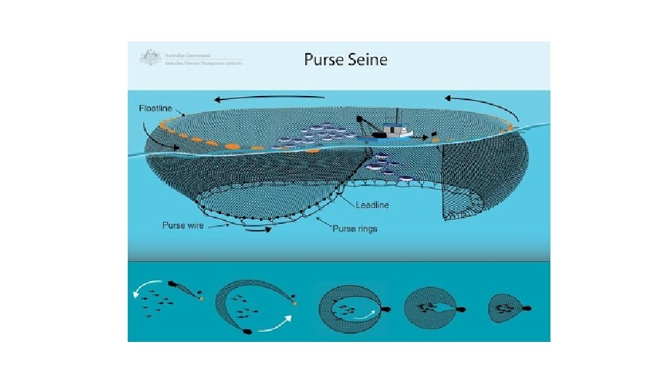 Types of gear used • Purse Seine - A large net that hangs vertically in the water by attaching weights along the bottom edge and floats along the top. • Otter trawl - Trawling, or dragging, is a commercial fishing method in which a trawl vessel (trawler or dragger) drags a cone-shaped net with a rectangular opening through the water to trap fish. • Longlining - Longlining is a hook and line fishery in which long lengths of baited hooks are laid on the ocean floor to catch mainly groundfish • Gill net - A gillnet is a long, horizontal mesh sheet with floats along the upper edge. It is set perpendicular to the path of the fish and designed so that incoming fish can get their heads but not their bodies through the mesh; thus the term gillnet. • weir: a device used to trap fish made of a net supported by wooden stakes