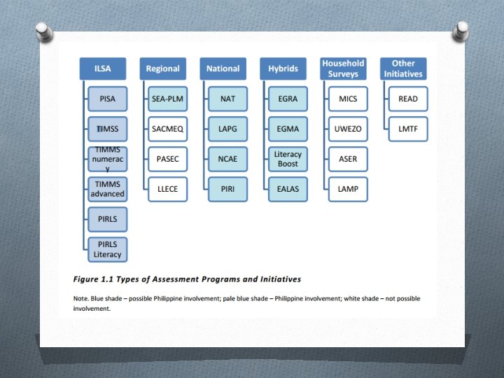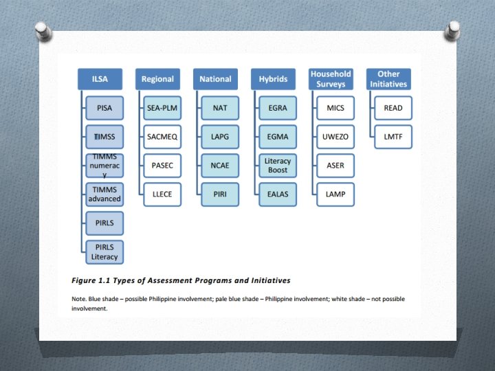 NATIONAL O The National Achievement Test (NAT), is a set of examinations taken in the Philippines by students in Years 6, 10, and 12. O Language Assessment for Primary Grades (LAPG)