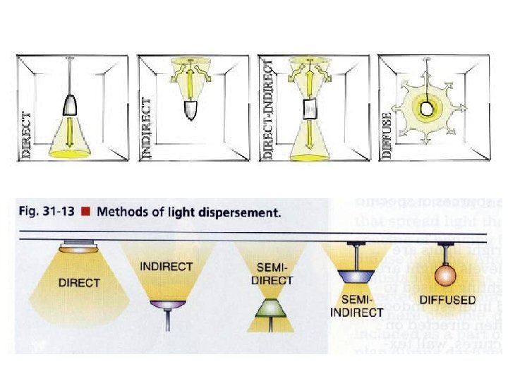 • INDIRECT: SOURCE IS HIDDEN, LIGHT IS DIRECTED TO CEILING, A COVE OR ANOTHER SURFACE FROM WHICH IT IS REFLECTED.