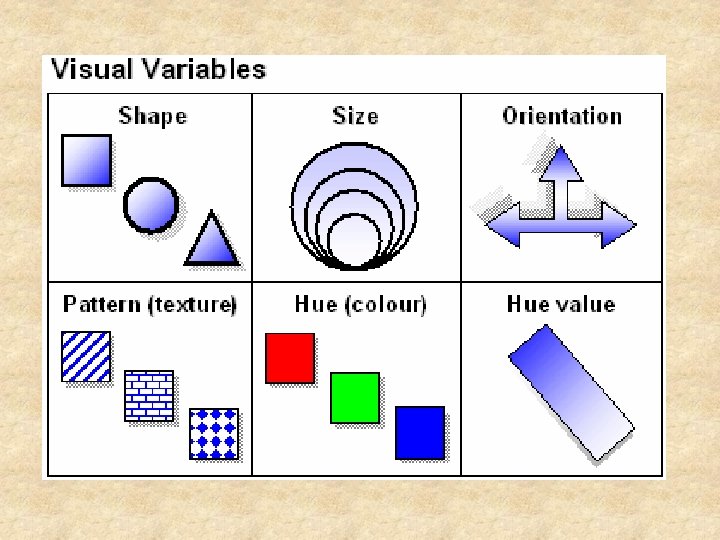 Map symbolization • Symbols are a code instead of text • Three kinds: point, line, area • Consider shape, size, orientation, pattern, color, value