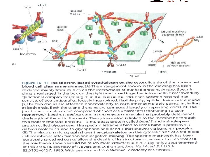 Major plasma membrane proteins of the Red Blood Cell • Spectrin (peripheral protein on cytosolic surface) • Tetramers linked together (& to band 4. 1 protein) by actin filaments • This forms a junctional complex • Serves as deformable protein mesh, allowing red cell to withstand stress on its membrane as it is forced through small capillaries (Fig 10 -31)