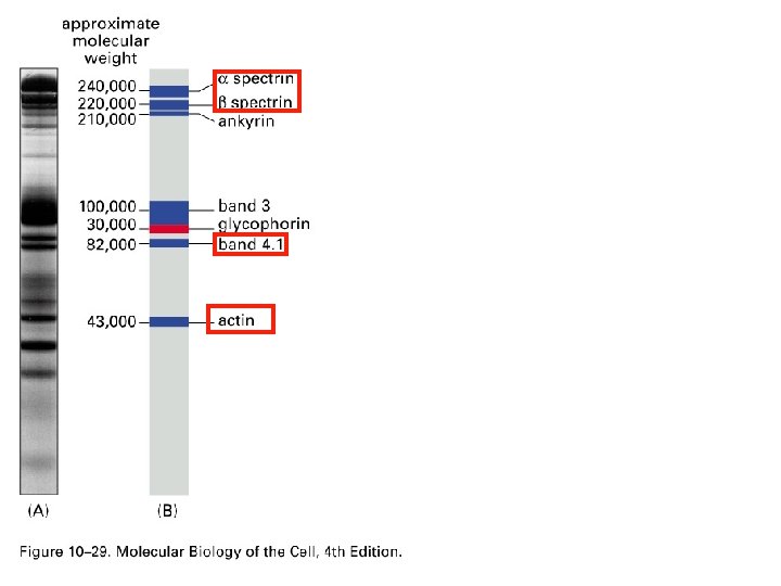 Major plasma membrane proteins of the Red Blood Cell • Spectrin (peripheral protein on cytosolic surface) • Maintains structural integrity of the red cell (e. g. biconvave shape) • Necessary as red cells go through small capillaries (Fig. 10 -30)