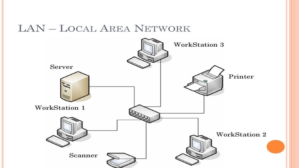Local Area Network (LAN) A Local Area Network (LAN) is a group of interconnected computers, printers and other devices that are situated within a radius of 1 km and normally they belong to a single organisation. The following are the salient features of a LAN: 1) LAN is limited by distance. 2) The rate at which data is transferred between two computers in the network is very high. 3) Cables are used as primary medium of data transmission. 4) The users share hardware as well as software resources through LAN.