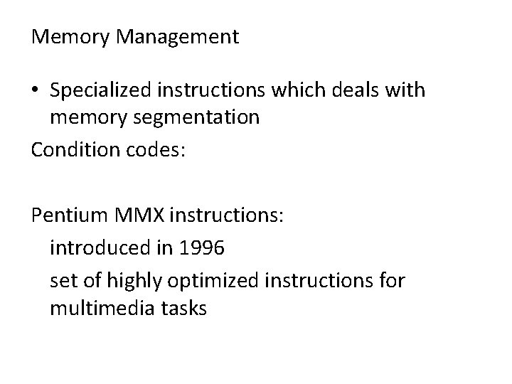 Memory Management • Specialized instructions which deals with memory segmentation Condition codes: Pentium MMX instructions: introduced in 1996 set of highly optimized instructions for multimedia tasks