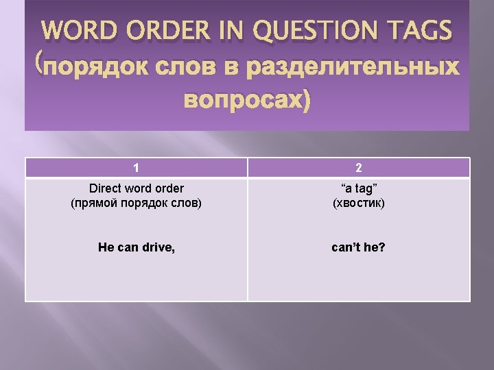 THE RULES OF FORMATION QUESTIONS TAGS 1 2 + He can drive, He can’t drive, can’t he? + can he?