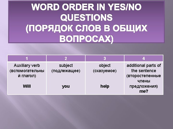 YES/NO QUESTIONS (questions without questions words, questions are usually formed by changing the word order; this means the auxiliary or modal verb comes before the subject). Can she type? Will you help me?