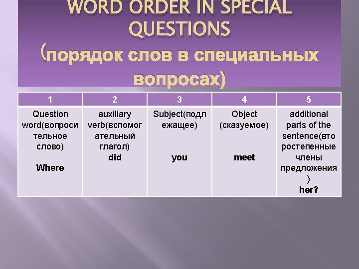 SPECIAL QUESTIONS (start with a question word) Who did you go out? Where did you meet her? What is your name?