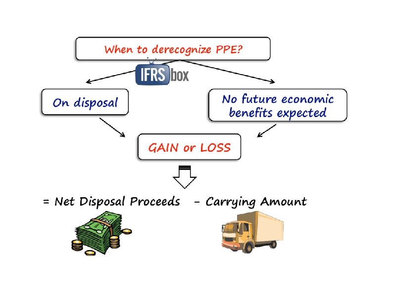 Impairment IAS 36 Impairment of Assets that prescribes rules for reviewing the carrying amount of assets, determining their recoverable amount and impairment loss, recognizing and reversing impairment loss and more. IAS 16 states that compensation from third parties for items of property, plant and equipment that were impaired, lost or given up shall be included in profit or loss when the compensation becomes receivable. For example, claim for compensation of damage on insured property from insurance company is recognized to profit or loss when insurance company accepts claim, closes the case and agrees to compensate (or after whatever procedure is agreed in the insurance contract). Derecognition IAS 16 prescribes that the carrying amount of an item of property, plant and equipment shall be derecognized on disposal; or when no future economic benefits are expected from its use or disposal. The gain (not classified as revenue!) or loss arising from the derecognition of an item of property, plant and equipment shall be included in profit or loss when the item is derecognized. The gain or loss from the derecognition is calculated as the net disposal proceeds (usually income from sale of item) less the carrying amount of the item.