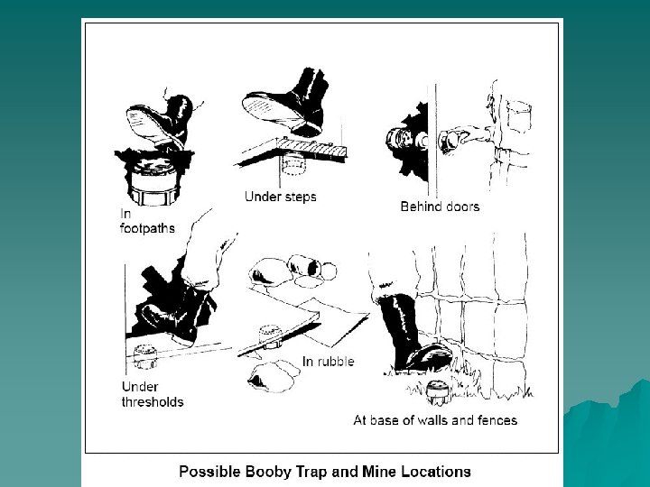 Grenade Trap: Two cans are tied to trees either side of the track with the delay train and safety pins removed and slide into the cans holding the striker levers in position. A trip wire is tied to both grenades. when the victim's foot pulls the trip wire the grenades are pulled from the cans causing instant detonation.