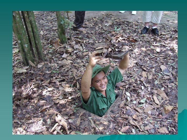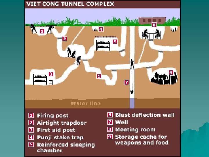 Tunnels Cont’d The orders coming from NLF headquarters were absolutely clear. Tunnels were not to be treated as mere shelters. They were fighting bases capable of providing continuous support for troops. Even if a village was in enemy hands, the Vietcong beneath were still able to conduct offensive operations. u There were complexes big and small scattered across the country. Each villager in a Vietcong area had to dig three feet of tunnel a day. There was even a standard handbook specifying how tunnels were to be built. The biggest tunnel systems were in the Iron Triangle and the Cu Chi District, only 20 miles from Saigon. u