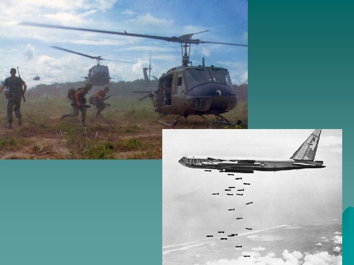 The Americans' tactics u They fought a hi-tech war, using B 52 bombers, artillery, helicopters, napalm and defoliants such as Agent Orange. This killed many innocent civilians, and failed to stop the Vietcong guerrillas. u They forced the peasants to leave Vietcong-controlled areas and made them live in defended strategic hamlets in loyal areas. This created immense opposition, and allowed Vietcong infiltrators into loyal areas.