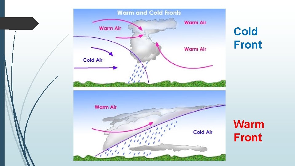 Warm Fronts Forms when a moist, warm air mass slides up and over a cold air mass. Slow, less dense warm air brings scattered clouds, fog, rain – long term