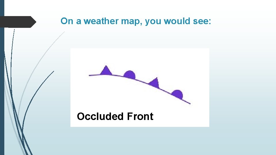 Weather brought by an occluded front: The temperature drops as the warm air mass is cut off from the ground & pushed upward. Can bring strong winds & heavy precipitation.