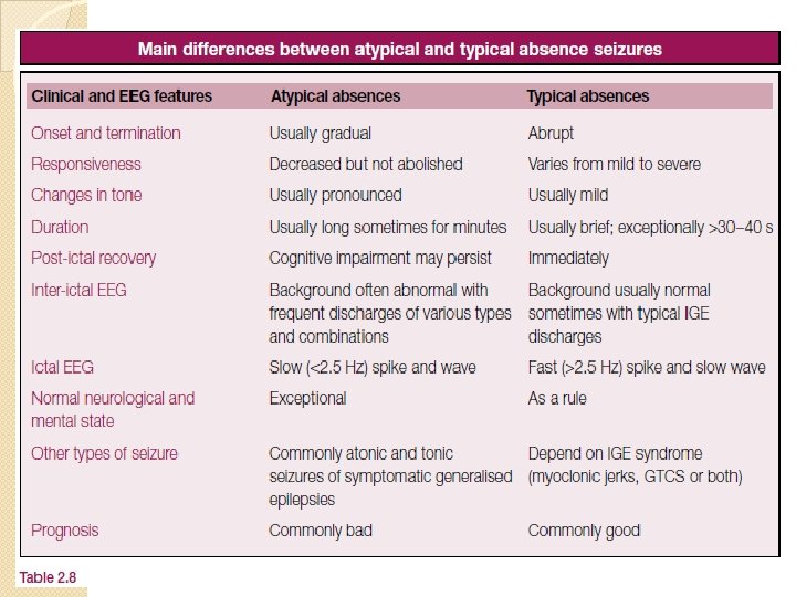 The differentiation of typical from atypical absence seizures �patients with atypical absences usually have learning disabilities and also suffer from frequent seizures of other types, such as atonic, tonic and myoclonic seizures �in atypical absences, onset and termination are not as abrupt as in typical absences, and changes in tone are more pronounced �the ictal EEG of atypical absence has slow (<2. 5 Hz) GSWD. These are heterogeneous, often asymmetrical, and may include irregular spike–wave complexes and other paroxysmal activity. Background inter-ictal EEG is usually abnormal.