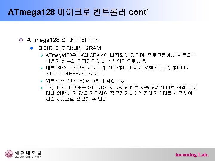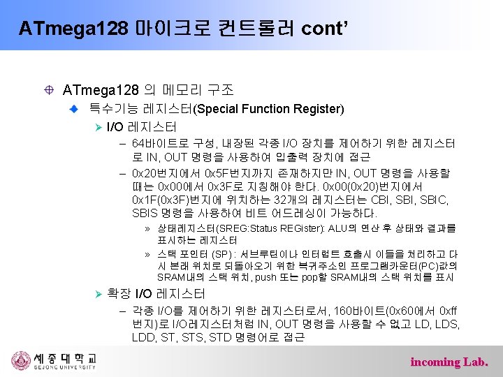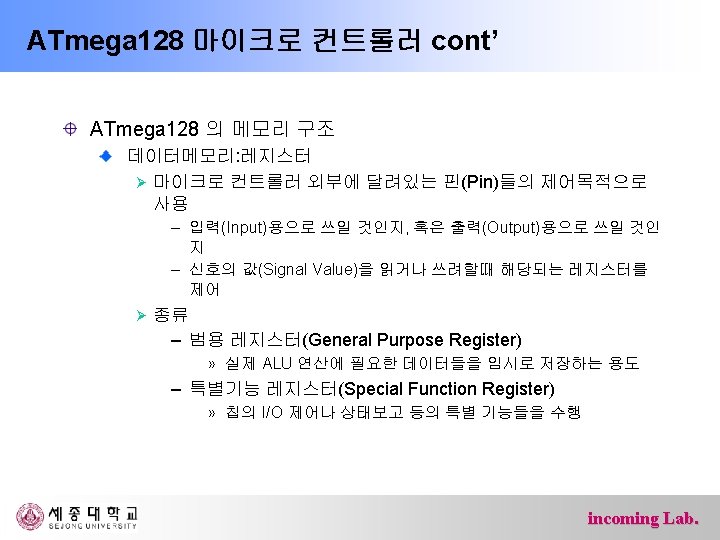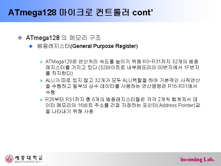 ATmega 128 마이크로 컨트롤러 cont’ ATmega 128 의 메모리 구조 범용레지스터(General Purpose Register) incoming Lab.