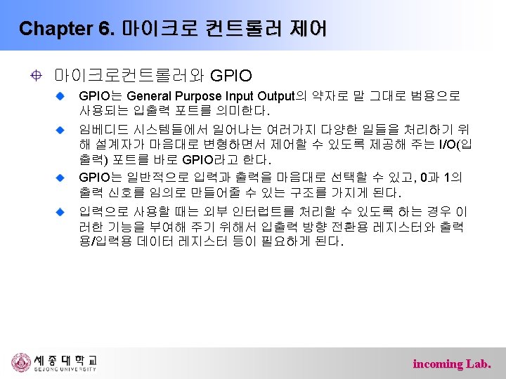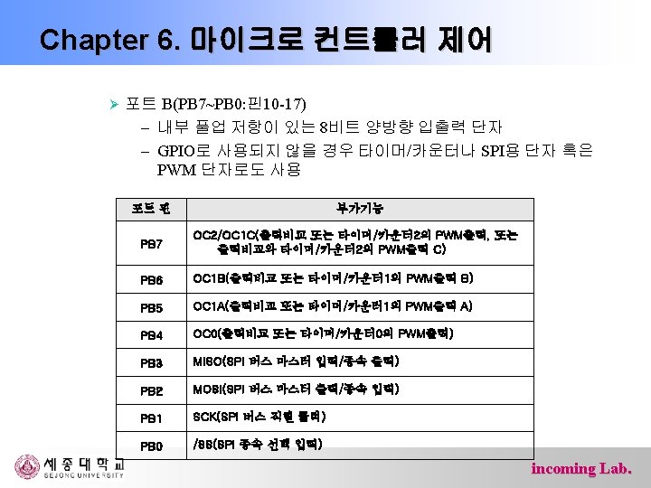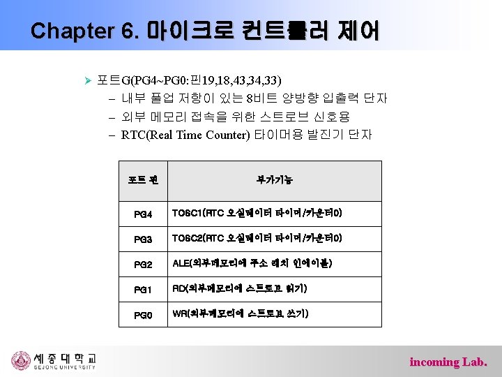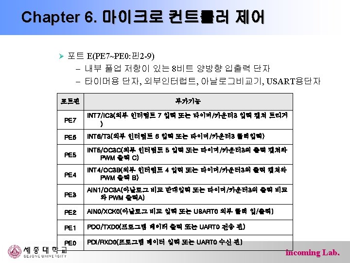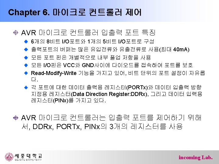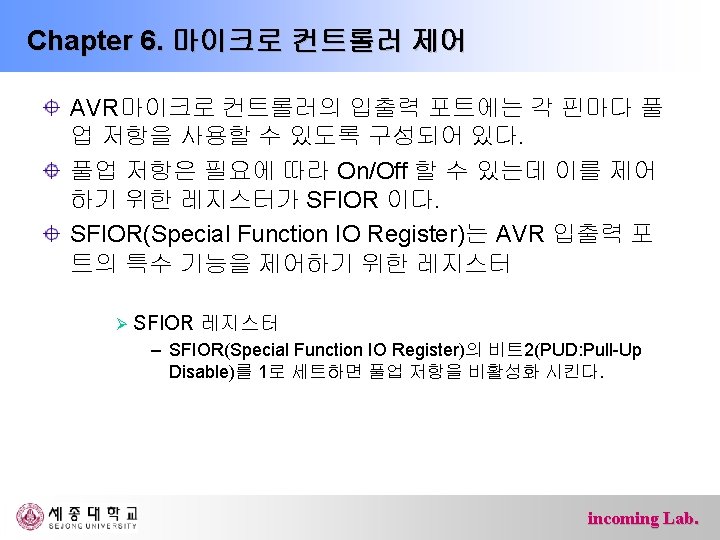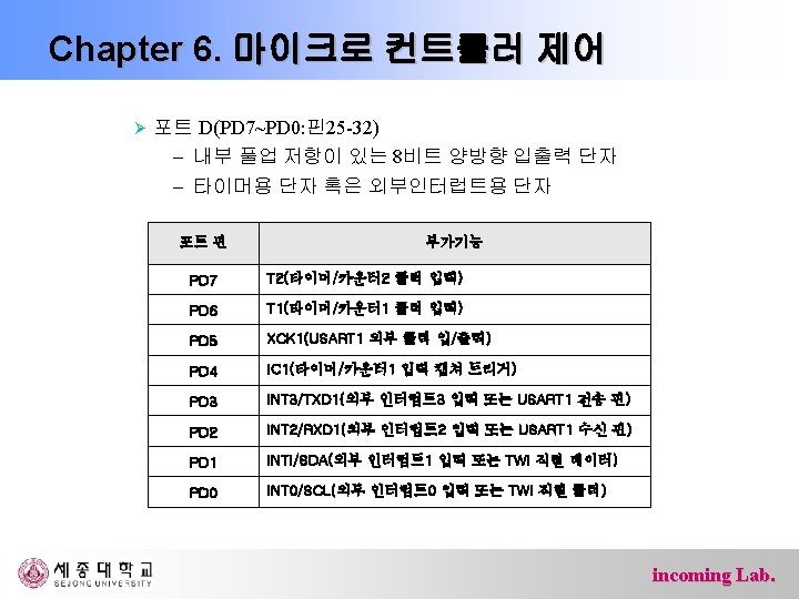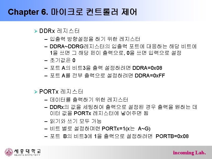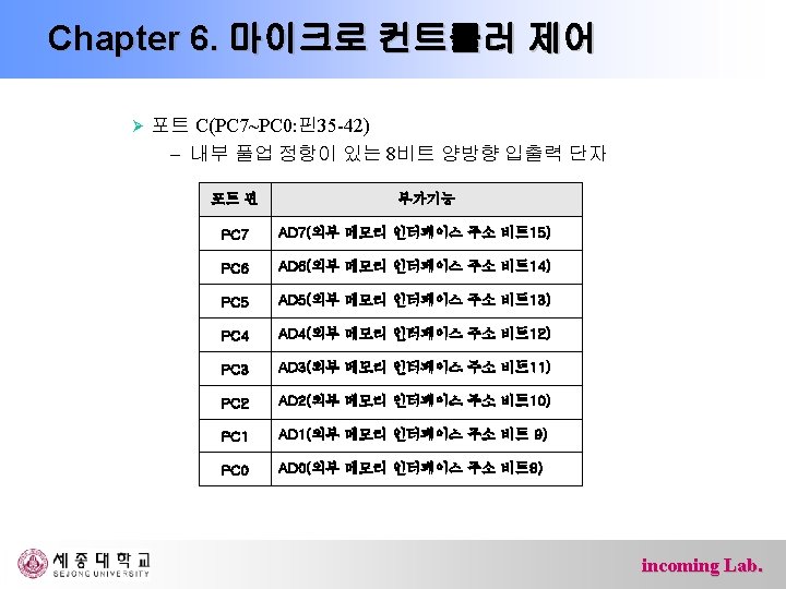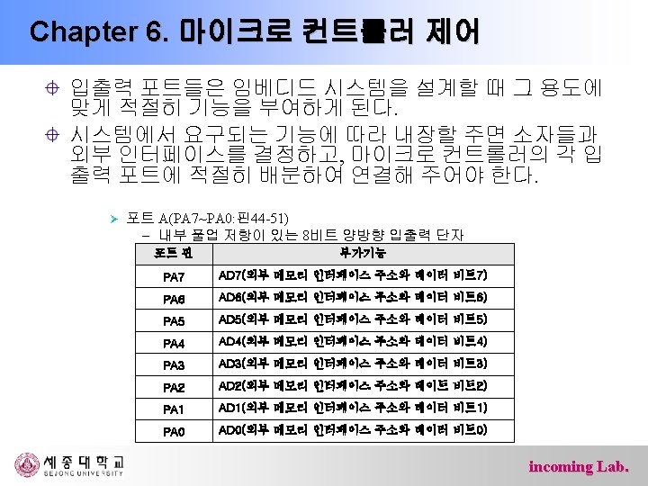 Chapter 6. 마이크로 컨트롤러 제어 Ø 포트 F(PF 7~PF 0: 핀54 -61) – 내부 풀업 저항이 있는 5피트 양방향 입출력 단자 – AD변환기 혹은 JTAG인터페이스용 단자 포트 핀 부가기능 PF 7 ADC 7/TDI(ADC 입력 채널 7 또는 JTAG Test Data Input) PF 6 ADC 6/TDO(ADC 입력 채널 6 또는 JTAG Test Data Output) PF 5 ADC 5/TMS(ADC 입력 채널 5 또는 JTAG Test Mode Select) PF 4 ADC 4/TCK(ADC 입력 채널 4 또는 JTAG Test Clock) PF 3 ADC 3 (ADC 입력 채널 3) PF 2 ADC 2 (ADC 입력 채널 2) PF 1 ADC 1 (ADC 입력 채널 1) PF 0 ADC 0 (ADC 입력 채널 0) incoming Lab.