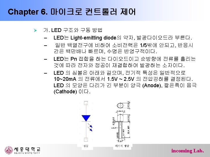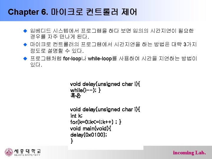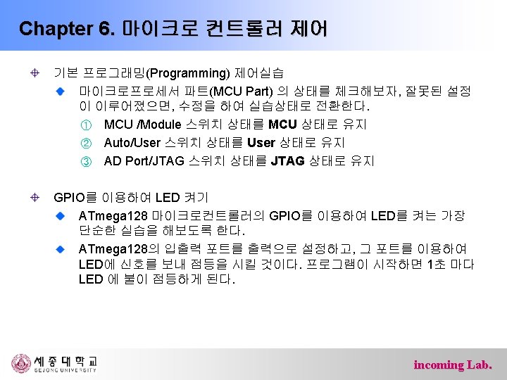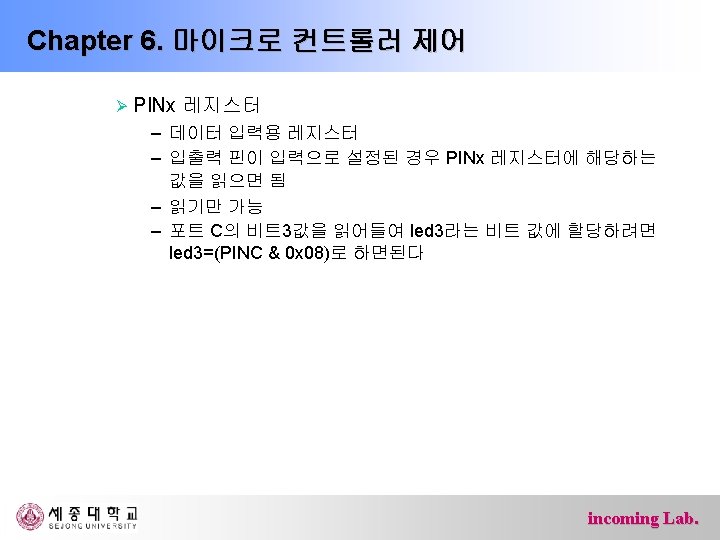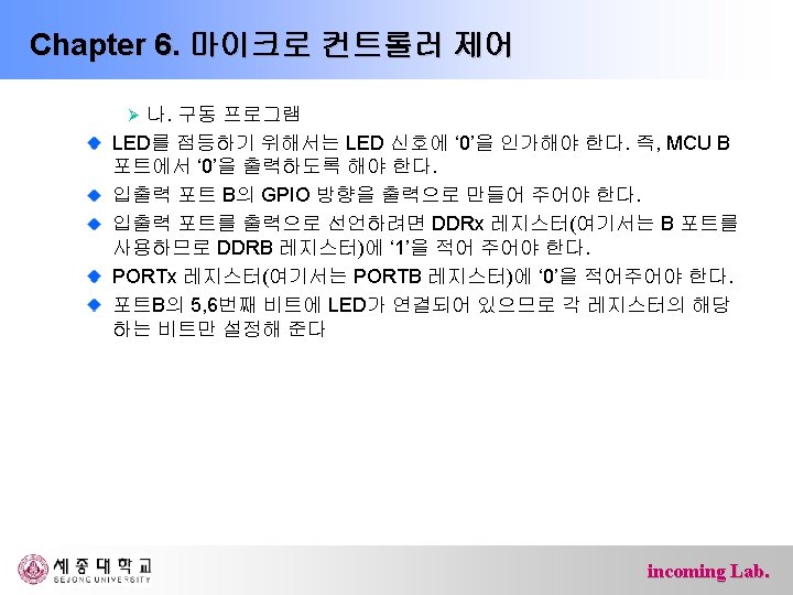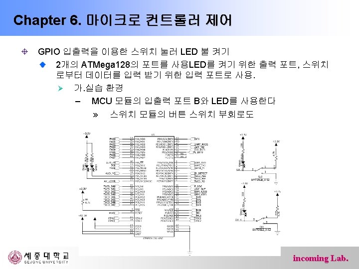 Chapter 6. 마이크로 컨트롤러 제어 #include<avr/io. h> int main(){ DDRB = 0 x. FF; DDRD = 0 x 00; while(1){ if(PIND & 0 x 40) PORTB |= 0 x 20; else PORTB &= ~0 x 20; if(PIND & 0 x 80) PORTB |= 0 x 40; else PORTB &= ~0 x 40; } return 0; } incoming Lab.