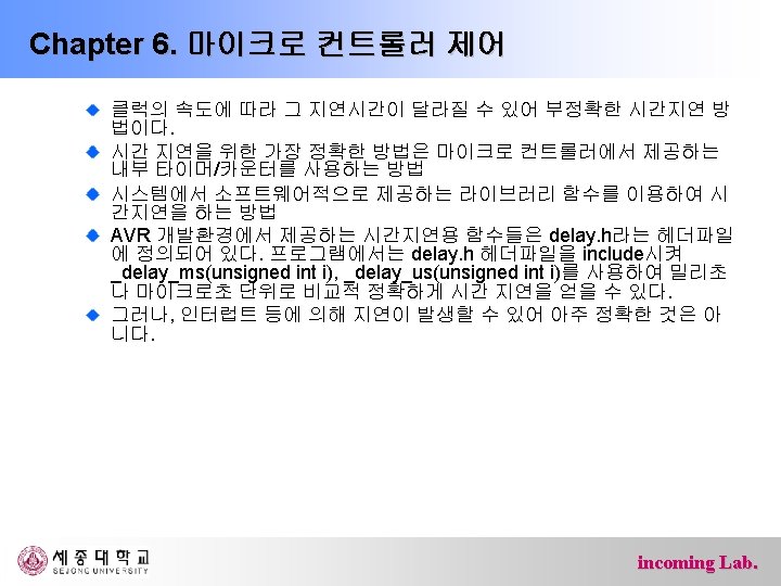 Reference code #include <avr/io. h> // 최종에서는 제거 #include <util/delay. h> int main(){ char count = 0, status = 0, led; DDRB = // DDRB 셋팅 DDRD = // DDRD 셋팅 while(1) { … // 뒷 페이지 참조 _delay_ms(1); // debounce } return 0; } incoming Lab.