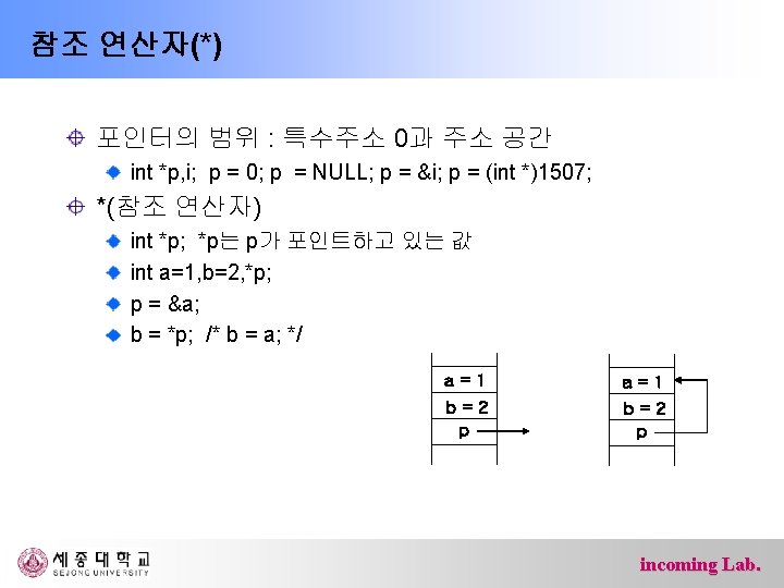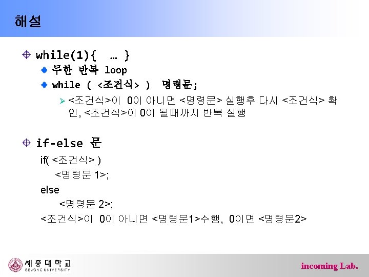 해설 /* … */ : 주석, 프로그램 수행과 상관 없음 #include <avr/io. h> : AVR 프로세서 관련 header DDRB, DDRD 등의 정의가 포함 DDRB = 0 x. FF; 모든 bit를 output DDRB |= 0 x 60; /* 5, 6 bit 만 output */ DDRB = DDRB | 0 x 60; | : bit-wise OR DDRD = 0 x 00; 모든 bit를 input DDRD &= ~0 x. C 0; /* 7, 8 bit 만 output */ DDRD = DDRD & 0 x 3 F; & : bit-wise OR ~ : bit-wise NOT incoming Lab.