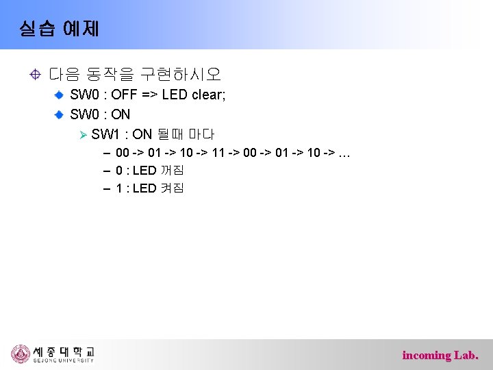 Reference code if( ) { //sw 0 : 아래쪽 PORTB = // LED 끔 count = status = 0; // count/status reset } else { if (PIND & 0 x 40) // sw 1 아래쪽 status = 1; else { // sw 1 윗쪽 if( status == 1 ) { status = 0; count++; count %= 4; } } // LED 켜기 } incoming Lab.