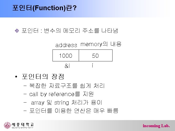 Memory organized as a linear array of cells (smallest addressable unit) size of memory address lines : number of cells data lines : number of bits in cells Ex) Ø 24 address line & 8 bit data line – 224 x 8 bit = 16 mega bytes Ø 1 giga bytes – 1 giga = 230 => address lines : 30, data lines : 8 Ø 2 GB memory (64 bit machine) – 2 GB=2* 230 * 8 bits = 228 * 8*8 – address lines : 28, data line : 64 – 256 MB*8 or 128 MB*16 incoming Lab.