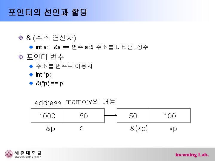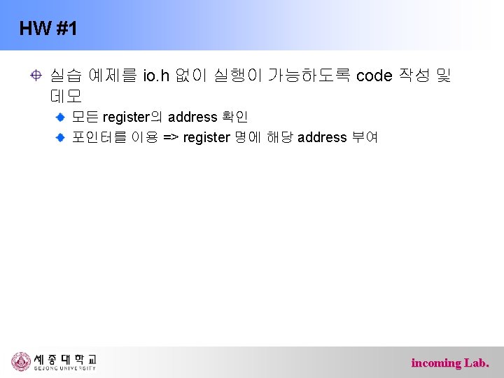 #define DDRB (*(volatile char *)0 x 37) (volatile char *)0 x 37 char 형 data의 address char : 8 bit volatile : 하드웨어에 의해 변경될 수 있음을 의미 (volatile char *) 0 x 37: 0 x 37이 address임을 나타냄 (*(volatile char *)0 x 37) address가 0 x 37인 실제 위치 DDRB register 0 x 37 DDRB incoming Lab.