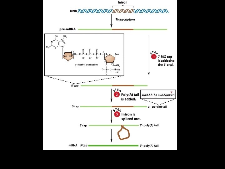 Modifications to Eukaryotic pre -m. RNAs 4 A 7 -Methyl guanosine cap is added to the 5’ end of the primary transcript by a 5’-5’ phosphate linkage. 4 A poly(A) tail (a 20 -200 nucleotide polyadenosine tract) is added to the 3’ end of the transcript. The 3’ end is generated by cleavage rather than by termination. 4 When present, intron sequences are spliced out of the transcript.
