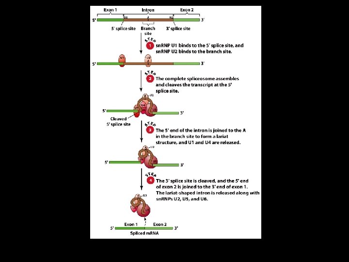 Splicing 4 Removal of introns must be very precise. 4 Conserved sequences for removal of the introns of nuclear m. RNA genes are minimal. – Dinucleotide sequences at the 5’ and 3’ ends of introns. – An A residue about 30 nucleotides upstream from the 3’ splice site is needed for lariat formation.