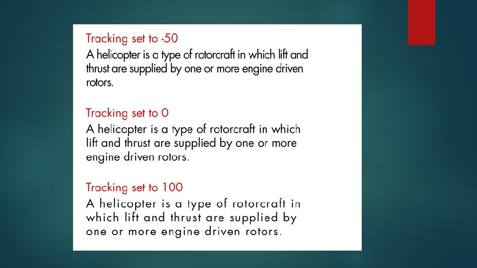 Tracking- Letter Spacing Tracking is the space between groups of characters.