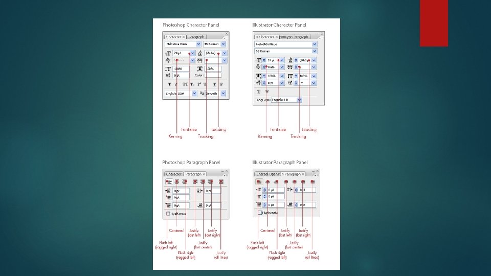 Working with Typography in Photoshop and Illustrator Graphics software such as Photoshop and Illustrator have powerful typesetting features. The concepts discussed above are all available to you in Photoshop and Illustrator. The two panels that deal with typography are the Character Panel (Window > Character) and Paragraph Panel (Window > Paragraph).