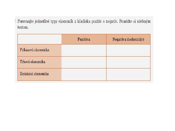 Príkazová ekonomika o Na základné ekonomické otázky dáva odpoveď štát. o Štát prikazuje podnikom, čo a ako budú vyrábať – centrálny plán (tzv. päťročnice). o Štát centrálne určuje mzdy aj ceny všetkých tovarov. o Nedostatky: nejaký tovar chýbal alebo bol nedostatkový, ľudia sa nemohli slobodne rozhodovať. . .