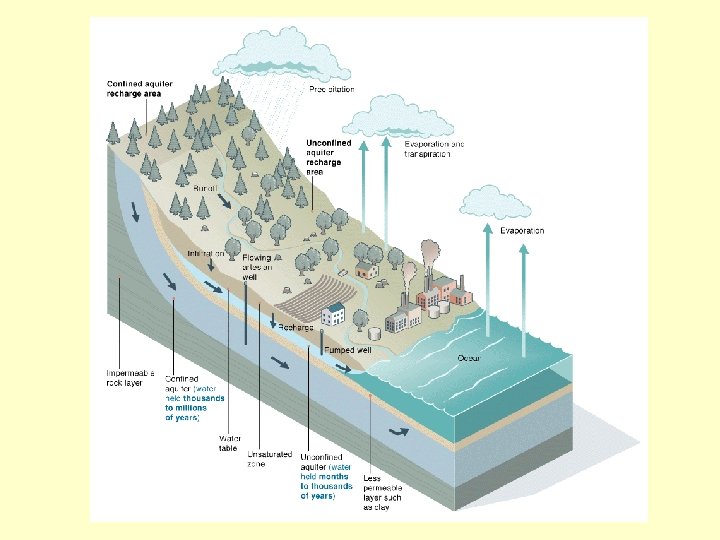 Errors! l Precipitation and evaporation are difficult to measure precisely over the oceans. They are mostly estimated from models and satellite data. l Groundwater reservoir estimates bear a inherent error in the fact that they are indirectly determined. l Soil moisture and evapotranspiration rates depend on indirect measurements and average soil quality and global/regional respiration rates