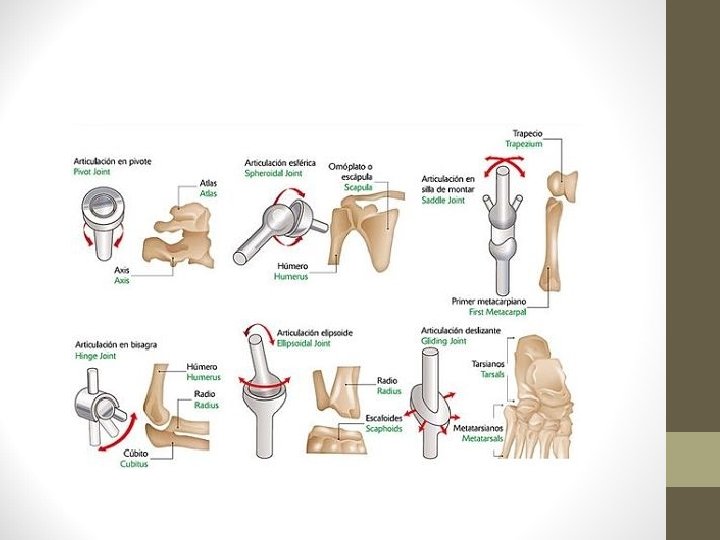 3. 2. Las articulaciones. Movimiento. • Los movimientos de las diartrosis: – Bisagra: movimientos en una sola dirección. Flexión y extensión: Ej. Rodillas, codo. – Pivote: permite solo rotación. Ej. Vértebras del cuello giran cabeza de un lado a otro. – Deslizante o plana: permiten desplazamientos laterales. Ej. Huesos muñeca. – Esferoidea: permite movimiento en todas direcciones. Ej. Hombro. – Elipsoidal: encaje del extremo oval de un hueso en una cavidad de otro. Ej: muñeca. – Silla de montar: dos articulaciones en forma de U. Ej. Pulgar.