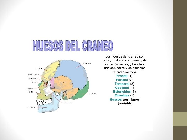 4. - Esqueleto de la cabeza. Cráneo. • Protege al encéfalo y está formado por 8 huesos soldados entre sí: • • • Frontal: frente. Parietal: Parte superior y lateral del cráneo. Occipital: nuca. Temporales: ambos lados del cráneo. Etmoides: fondo de las fosas nasales. Esfenoides: base del cráneo.