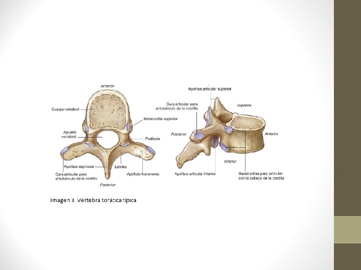 5. - Esqueleto del tronco. 5. 1. Columna vertebral. • Se extiende desde la cabeza hasta la pelvis. Protege la médula espinal y sirve de anclaje a otros hueso. Tiene forma de S alargada y está constituida por 33 vértebras, separadas porciones cartilaginosas llamadas discos invertebrales. • Partes de las vértebras: – Cuerpo vertebral. – Arco vertebral que delimita el orificio vertebral donde se aloja la médula espinal. • Apófisis espinosa. Posición posterior. • 2 apófisis transversas: laterales. • 4 apófisis articulares dos hacia arriba y dos hacia abajo que encajan vértebras entre sí.