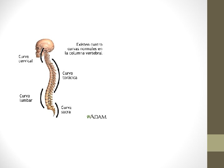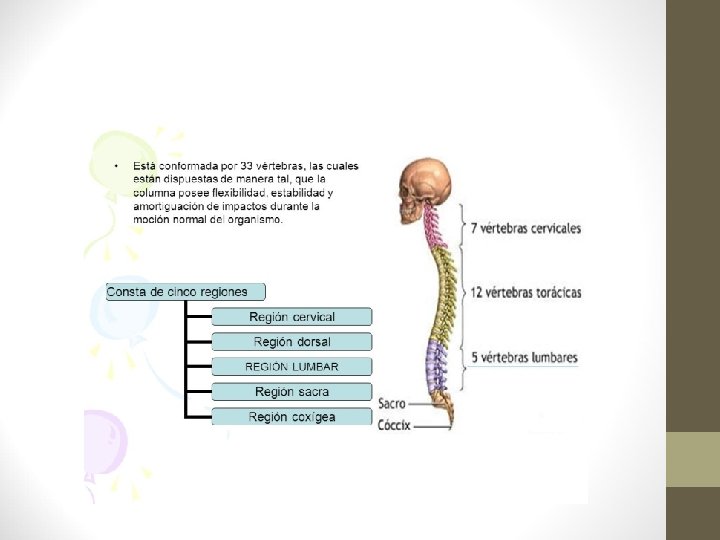 5. - Esqueleto del tronco. 5. 1. Columna vertebral. • Presenta 4 curvaturas que permiten una posición del cuerpo vertical y equilibrada aumentando la resistencia: • 2 convexas hacia delante: cervical y lumbar. • 2 convexas hacia atrás: dorsal y sacra. En l columna vertebral se distinguen 5 regiones: • Cervical: comprende 7 vértebras, la primera se llama atlas. • Dorsal: Formada por 12 vértebras, en las que se articulan las costillas. • Lumbar: 5 vértebras. • Sacra. 5 Vértebras soldadas entre sí formando el hueso sacro. • Coxígea: al final de la columna comprende 4 -5 vértebras constituidas únicamente por el cuerpo vertebral soldadas entre sí formando el hueso cóxis.