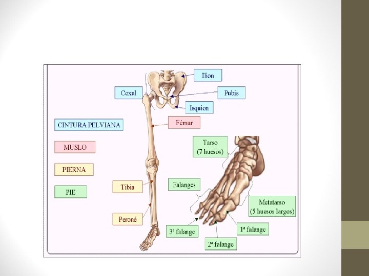 6. - Esqueleto de las extremidades. 6. 4. Extremidades inferiores. • Formadas por los siguientes huesos: • • Fémur. Muslo. Rótula. rodilla. Tibia y peroné en la pierna. Falanges. Dedos.