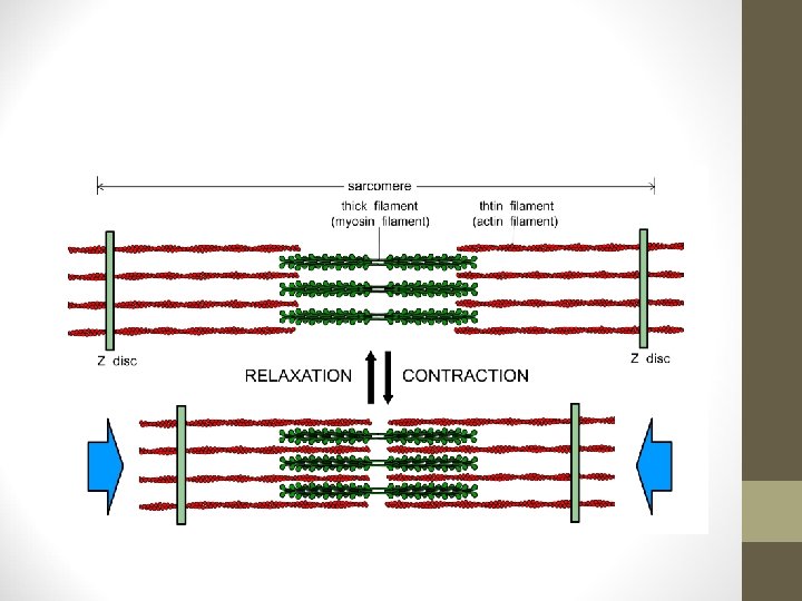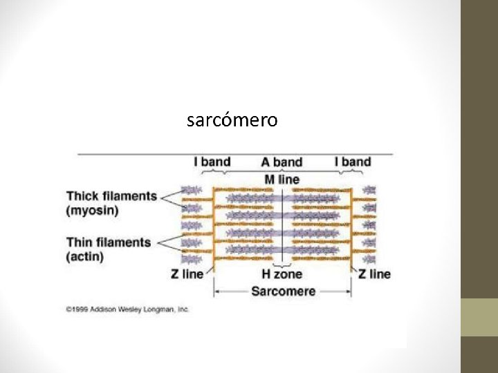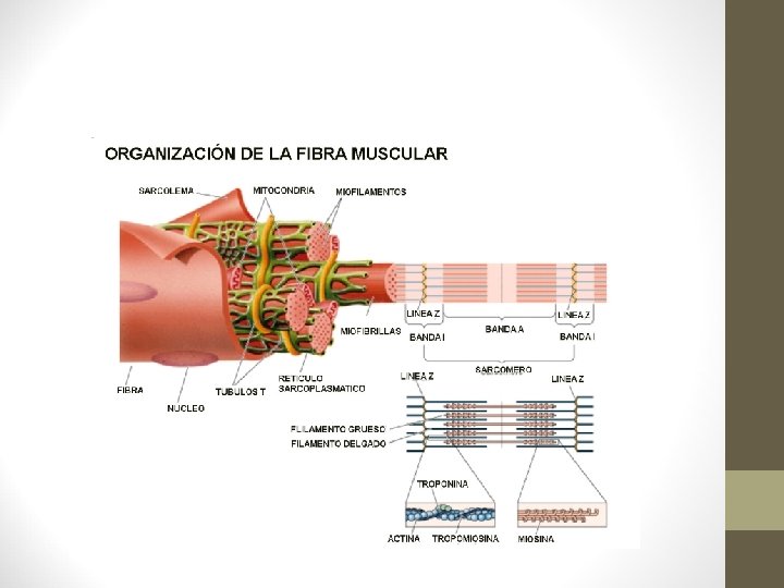 7. - El sistema muscular. Tejido muscular • La repetición de sarcómeros confiere al músculo estriaciones características alternando bandas oscuras (bandas A), y zonas más claras (bandas I). Los sarcómeros se unen por los discos Z. De él salen los filamentos finos de actina, y en la parte central del sarcómero, entrecruzando con la actina hay filamentos gruesos de miosina. Cuando el músculo está relajado en el centro de la banda A, hay otra banda algo más clara llamada H, en la que solo hay miosina. Con el músculo contraído la H no aparece. • La fibra muscular se contrae mediante acortamiento de los sarcómeros, de modo que cuando las líneas Z se aproximan, la banda I se estrecha y la H desaparece. En este proceso se utiliza energía acumulada en el ATP.