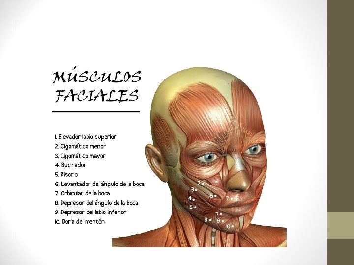 4. - Esqueleto de la cabeza. Cara. • Protegen los órganos de los sentidos y la cavidad bucal. – – – – – Vómer: forma parte del tabique nasal. Cornetes. Interior de las fosas nasales. Nasales: 2 parte superior de la nariz. Lacrimales: contienen conductos lacrimales y forman parte de las órbitas. Pómulos: mejillas. Maxilares superiores. Palatinos: parte superior paladar. Maxilar inferior. Hioides: base de la lengua. Forma de U. Oído medio: martillo, yunque y estribo.