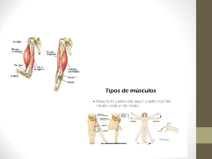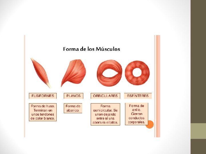 8. - Tipos de músculos. • Según su forma: • Fusiformes. Parte central más ancha y final más estrecha donde se unen a los tendones. Según los tendones a los que se una se llaman bíceps, tríceps o cuádriceps. • Planos y anchos: frontal. • Cortos: intervertebrales. • Orbiculares: forma semicircular. Ej. Labios. • Esfínteres: ej. Anal. Según su función: . Flexores y extensores: flexionan y extienden los elementos de una articulación. Ej bíceps( flexiona el antebrazo), tríceps extiende el antebrazo, son antagónicos. - Abductores y aductores: acercan o alejan una extremidad al eje corporal. Ej. Pronadores y supinadores: giran una extremidad arriba o abajo.