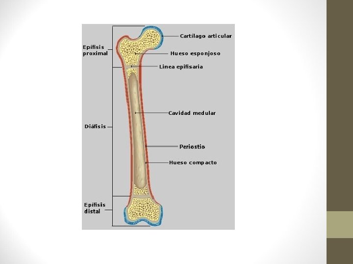 3. 1. Tipos de huesos. • • Huesos largos: fémur, tibia, peroné. Huesos cortos: muñeca y tobillo. Huesos planos. Omóplato, cráneo. Huesos irregulares: Vértebras. Partes: - Diáfisis. Parte central larga del hueso, formada por tejido óseo compacto y en cuyo interior se encuentra la médula ósea. - Epífisis: mas ancha formada por hueso esponjoso, recubierto por hueso compacto.