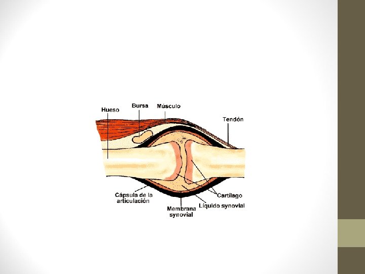 3. 2. Las articulaciones. • Son el punto de contacto entre dos o más huesos, entre hueso o cartílago. Facilitan los movimientos mecánicos del cuerpo haciendo que sea más flexible. Partes: – Cartílago: cobertura presente en los extremos de los huesos (epífisis). Reducen la fricción que provoca el movimiento. – Cápsula sinovial: envoltura cartilaginosa que envuelve la articulación. Segrega un líquido que la protege. – Tendones: Tejido conectivo. Se sitúan a los lados y se unen a los músculos. – Ligamentos. Tejido conectivo, elásticos y firmes que protegen la articulación y limitan sus movimientos. – Bursas: Bolsas con líquido que amortiguan la fricción del movimiento. Se encuentran en huesos y ligamentos. – Menisco: cartílago de la rodilla con forma de medialuna, que la amortigua cuando sostiene una carga.