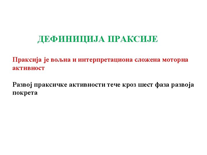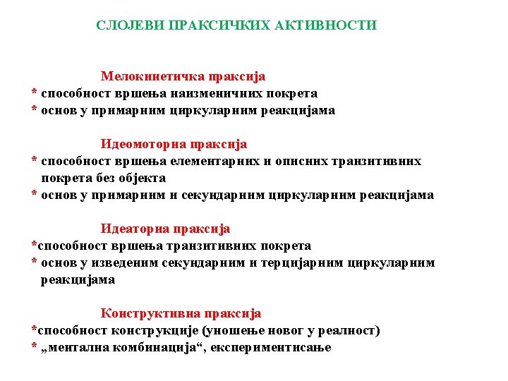 U prvoj koloni su poremećaji koju su vezani za oblast kortikalne organizovanosti kao centralnog polja integracije osećajnih i psihomotornih iskustava ličnosti u razvoju. Počinje se sa onim kliničkim slikama koje primaju draži, procenjuju ih i tako daju podlogu za aktivnosti ličnosti. To su oblasti gnostičkih predela i gnostičkih funkcija. Njihova nedograđenost se odražava na celokupnu aktivnost ličnosti. U drugom delu prve kolone su oblici praksičkih aktivnosti kojima dete ispoljava svoje načine delovanja i svoj oblik postojanja u prostoru, vremenu i spacijalnom polju. U drugoj koloni su poremećaji govornih aktivnosti koji se tiču užih područja kortikalne organizovanosti. Nedograđena govorna aktivnost ometa komunikaciju sa svetom, a to zapravo znači socijalizaciju ličnosti. U trećoj koloni se nalaze poremećaji psihomotorike u užem smislu. Svedeni su na tri osnovne kliničke slike koje se ne mogu objasniti na drugi način osim analizom struktura i funkcija psihomotornog sprega.