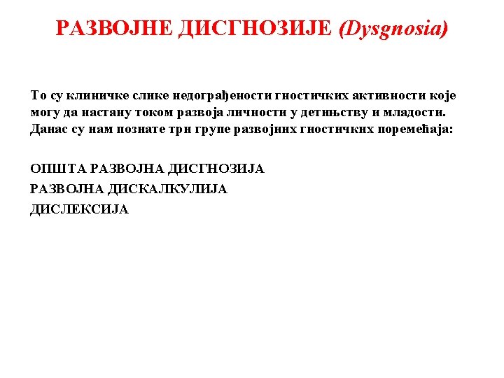 U prvom redu nalaze se one kliničke slike koje remete razumevanje iskustava o svetu, draži ili impulsa ili poruka koje iz sveta idu ka ličnosti. U drugom i trećem redu očekuju se kliničke slike srodne onima u prvom redu ali sa znatno manje izraženim ili suženim osobinama koje smo pomenuli. Tako se u trećem redu nalazi razvojna disfazija uporedo sa razvojnom disleksijom. U jednoj ovoj kliničkoj slici dete prepoznaje slova, pa i glasove, ali ne izgovara pročitanu reč u njenoj celini i jasnoći koju joj daje mesto u rečenici, dok u drugoj prepoznaje glasove i jasno izgovara, ali ne ume da izgovori reč jasno uz upotrebu glasova kojima je ovladalo. Četvrti red počinje s opštom razvojnom dispraksijom, dakle, sa jednim opštim praksičkim poremećajima usled neskladnog razvoja struktura psihomotornog sprega.