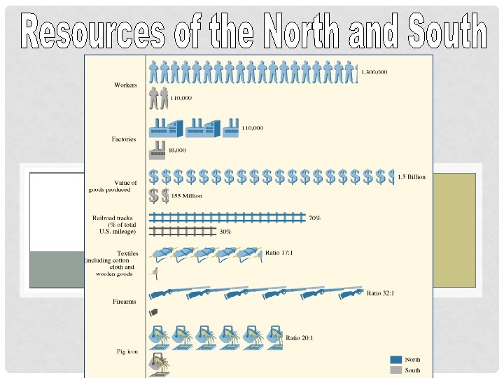 NORTHERN ADVANTAGE • Pop. 22 mil as compared to 9 mil. In south • Outnumbered South 3 to 1 in white males • 90% of manufacturing in North • North and West were open to agriculture • North had more capital ($) • 70% of RR in North • Shipping and Navy controlled by North • Lincoln